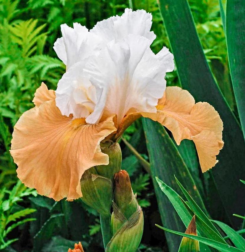 värvikombinatsiooniga iirise sort. Püstised õiekattelehed on valged, rippuvad