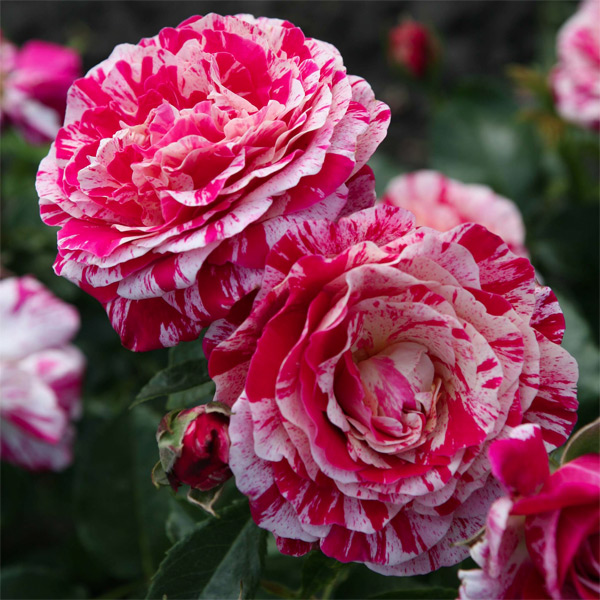 Punased, valged triibud, helekollased triibud, täidisõied. Õitseb kogu hooaja vältel.
